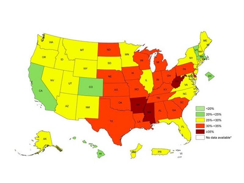 The state with the highest rate of obesity was Arkansas at 35.9 percent. Colorado had the lowest rate with 21.3 percent.
