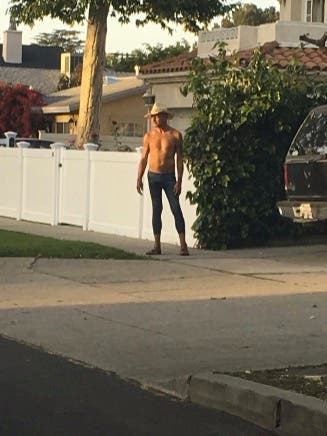 Residents spotted a man wearing mid-calf leggings, no shirt and a cowboy hat masturbating in public at 6 p.m. Thursday in 15000 block of Moorpark Street, according to the Los Angeles Police Department.