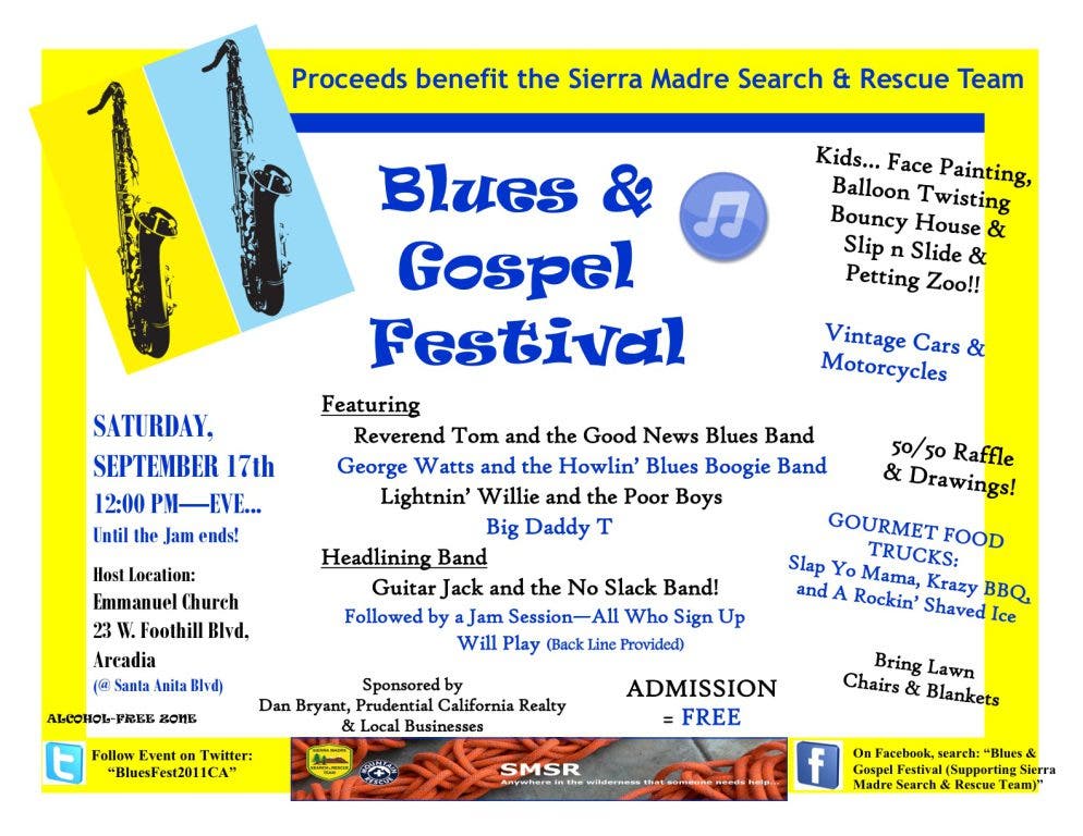 BBQ & Blues. Proceeds benefit the Sierra Madre Search & Rescue Team. Fun for everyone! Vintage cars, kids activites, gourmet food trucks, music & food all day long! Bring lawn chairs & blankets. Open jam session bring your instruments, signup and play! Sat. Sept 17th; 12pm-8pm. Emmanuel Church 23 W. Foothill Blvd. Arcadia @Santa Anita Blvd
