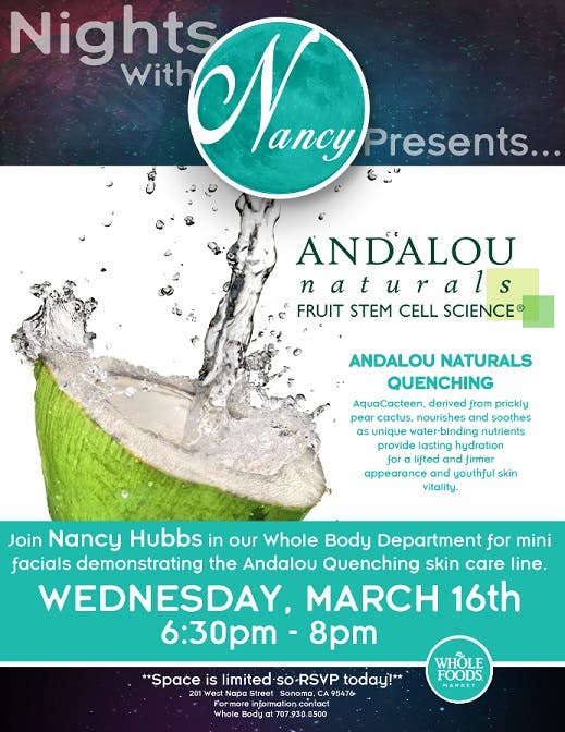 Join Nancy Hubbs, Whole Foods Market Sonoma's in-store esthetician, for a Whole Body Event full of pampering!