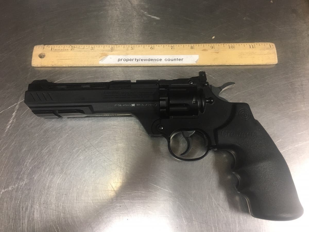 "The replica was a pellet gun designed to the specifications of a real gun and matched the description provided by the victim," police said. "Duran was identified as the suspect and was arrested for brandishing a replica firearm in a threatening manner and for two outstanding misdemeanor criminal warrants."