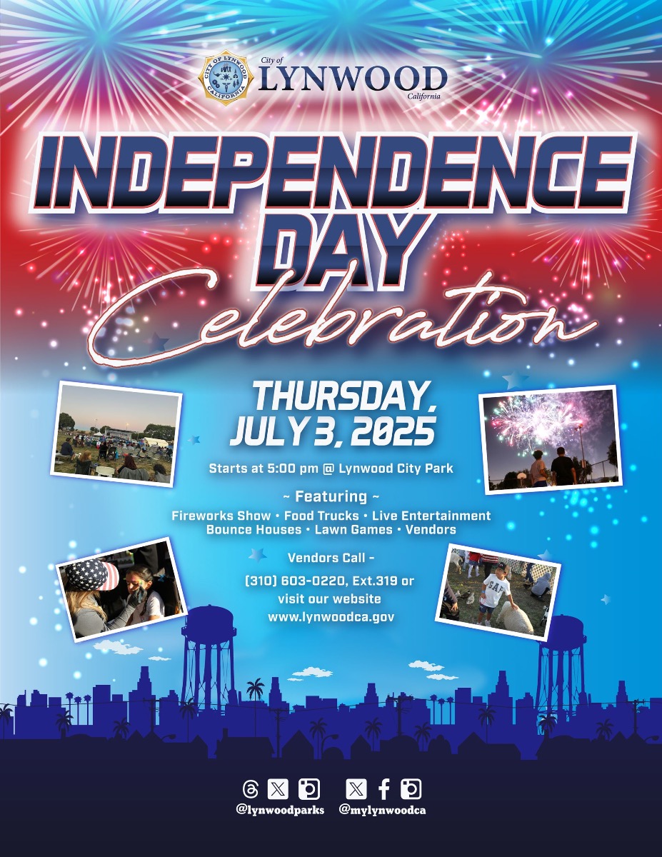 "Join us Thursday, July 3rd at Lynwood City Park (near the baseball fields) for our annual Independence Day Celebration! Enjoy live performances, inflatables, food booths, and a spectacular fireworks show!"
