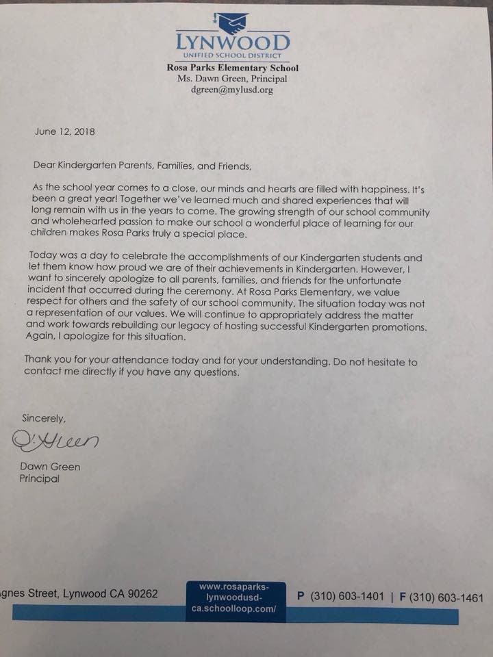 The outcry from the public is tremendous and many wonder why would anyone bring such violence and even bring firearms to an elementary school graduation . It is very shameful to bring such a dark over what should have been a day of celebration. Our youth is our future and should not be subject to this at school. Has it come to the point where we need to have armed security and metal detectors at these events? I am in no way saying that LUSD is responsible for what happen but this was a definite wake up call and wonder if any extra measures will be taken in the future. A statement was also released by the school(See photo).