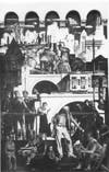 Sheets created three panels for the school (then know as South Pasadena Junior High) entitled “The Farm”, “The City”, and “The Harbor”. Sheets created images of the Southern California he had known growing up just after the turn of the 20th century. Orange groves, L. A. City Hall, and the busy port of Los Angeles were just some of the landmarks that students could see when they studied these 14 x 10 foot paintings. He and fellow Chouinardian Ben Messick spent many hours painting directly on wet plaster. As the plaster dried a chemical reaction occurred and the paint “became” part of the wall (unlike a mural where the paint sits on top of the wall).