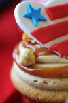 - Heart- Peanut butter chocolate chip cake with peanut butter frosting, homemade caramel drizzle and Cracker Jacks adorned with a red, white and blue fondant heart