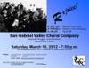 Under the direction of Alexander Ruggieri, the concert features Britten’s "Rejoice in the Lamb," Purcell’s "Rejoice in the Lord Alway," and Holst’s "Psalm 86." Tickets: $15 at the door, $12 seniors & students. Advanced purchase: $12/$9 at www.sgvccmarch2012.eventbrite.com, choralcompany@gmail.com, or 626-579-2433.