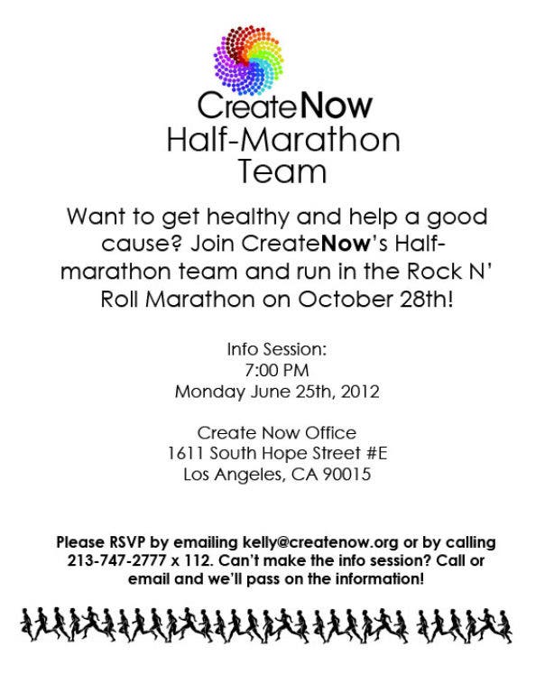 Create Now, a non-profit that provides arts mentoring to at-risk and high-risk youth, is putting together a team for the Rock N’ Roll Half Marathon! The marathon will take place on October 28th, 2012 and is 13.1 miles. Beginners are encouraged and we have partnered with a trainer, coach Robert Mills, to provide 16 training sessions for $100 to get you in marathon shape! Training sessions will take place in the Rose Bowl area of Pasadena.