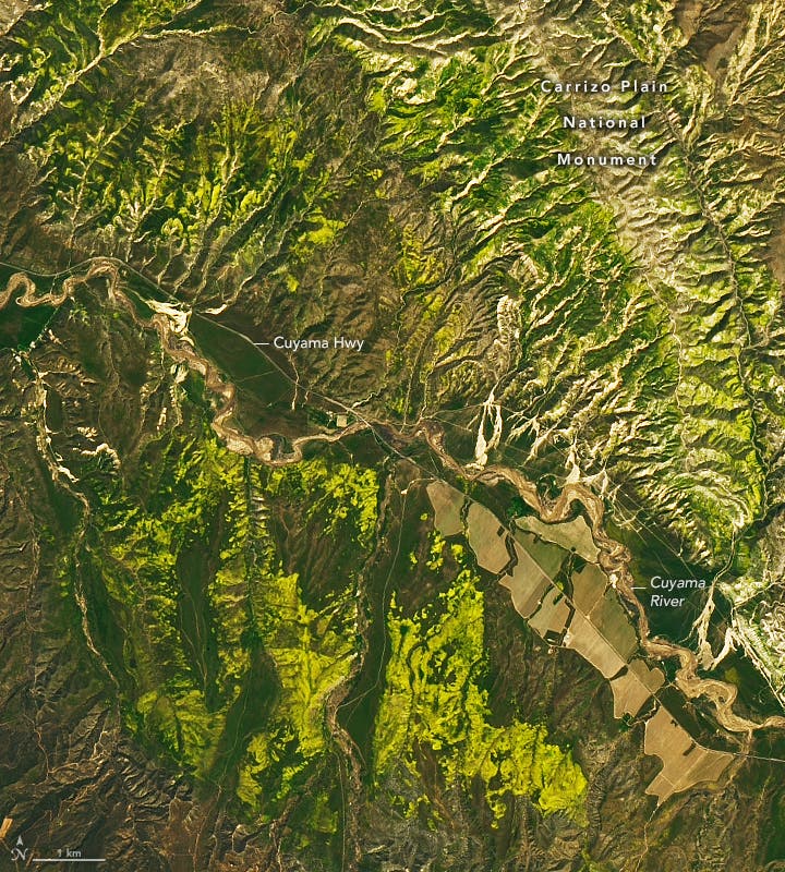 Seen from the ground in Northern California, the Carrizo Plain National Monument is achieving colors not seen since 2019.