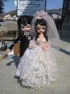 This bride and groom doll set is from the 1960s, their exaggerated features reminiscent of the decade. It came from a carnival, and was likely won by Rodriguez as a prize.