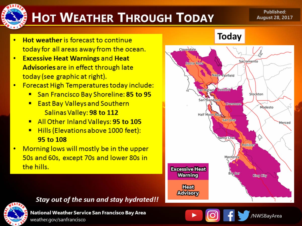 BAY AREA, CA β After a weekend of triple-digit temperatures across the Bay Area, Monday was expected to bring similar heat to "all areas away from the ocean," the National Weather Service forecast said. It won't be until mid-to-late week that the region will see some relief overall, though those on the coastline are in for much more agreeable weather as of Monday.