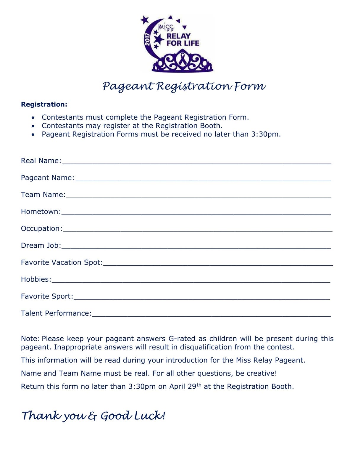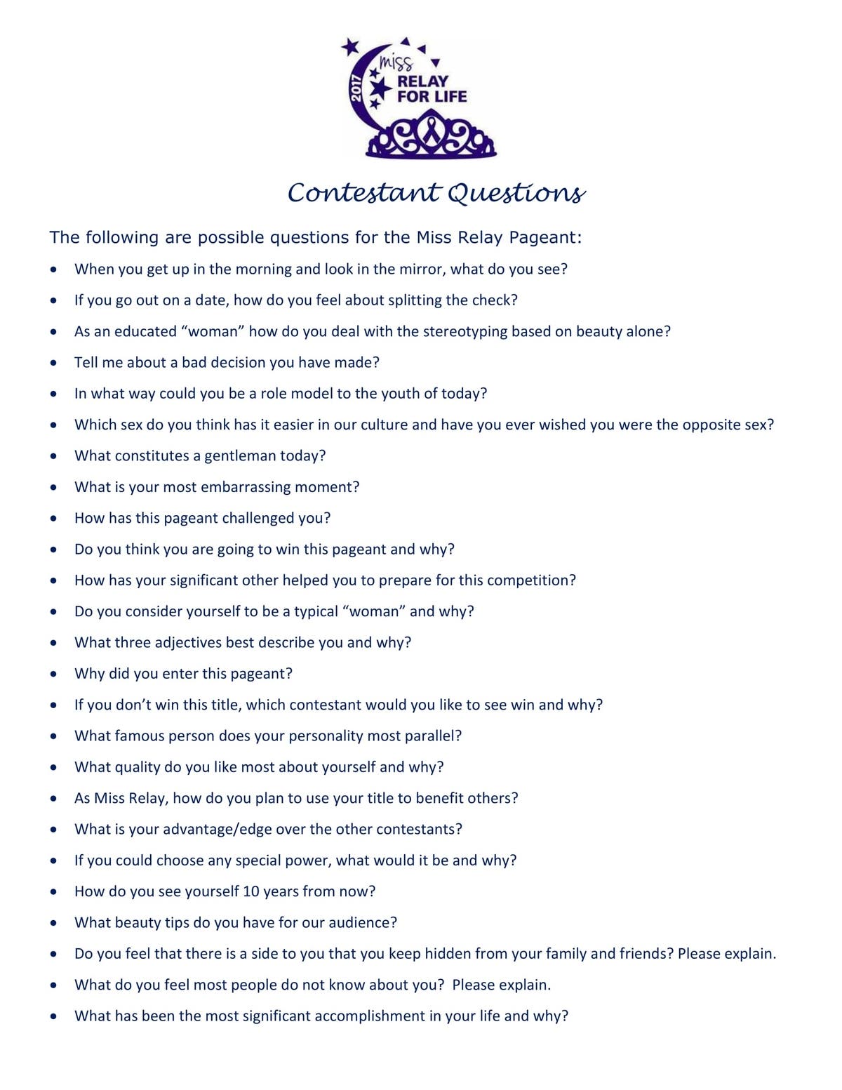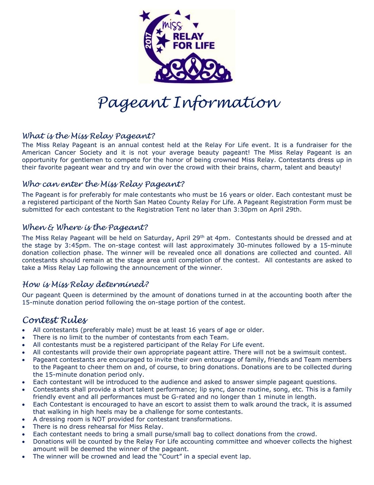 We will also be holding our "Miss Relay" Contest: