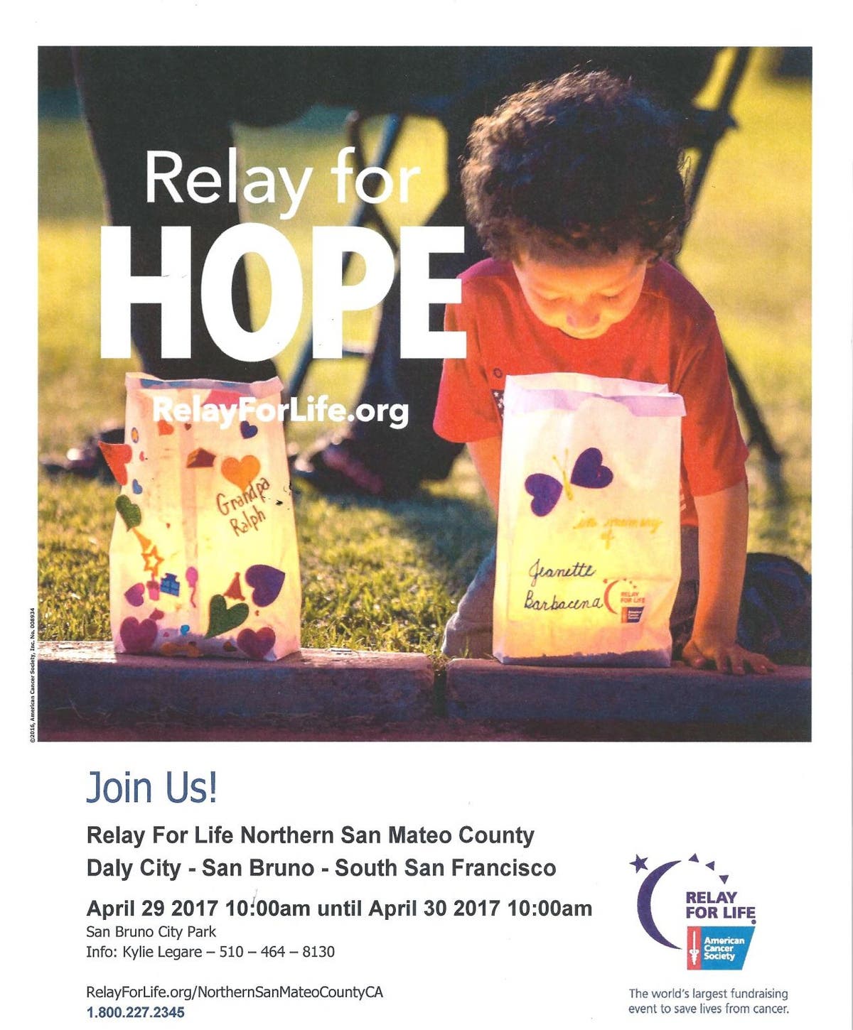 We hope you will be considering joining us this Saturday April 29th 2017 starting at Opening Ceremonies at 10:00 a.m. in San Bruno CA City Park as Daly City, South San Francisco, and San Bruno supporters kick off "Relay For Life Northern San Mateo County CA".
