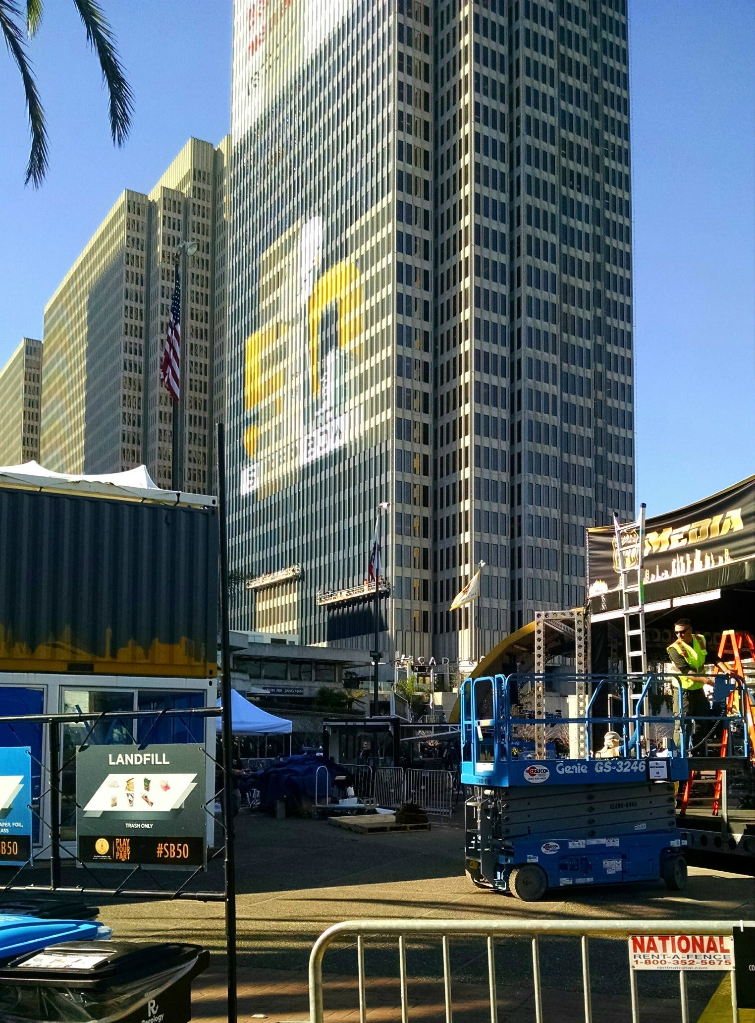 The banners, which cover most of the building on two sides, can be seen towering over the Super Bowl City fan village area now taking shape at Justin Herman Plaza.