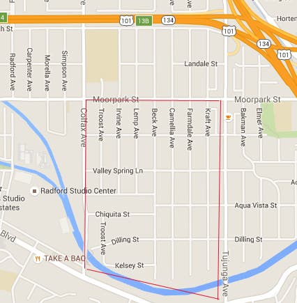 The boundaries are Moorpark to the north, Colfax to the west, Tujunga to the east, and The Los Angeles River to the south.