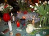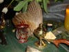 Sylphlike women, dressed in black, dance and sway to the rhythm of thumping hand drums around an altar in the center of the room. It is a table covered with ritual objects like the ones I saw at last summer’s rite. Objects from nature, which represent the four elements, earth, air, fire and water, are arrayed in the four directions.