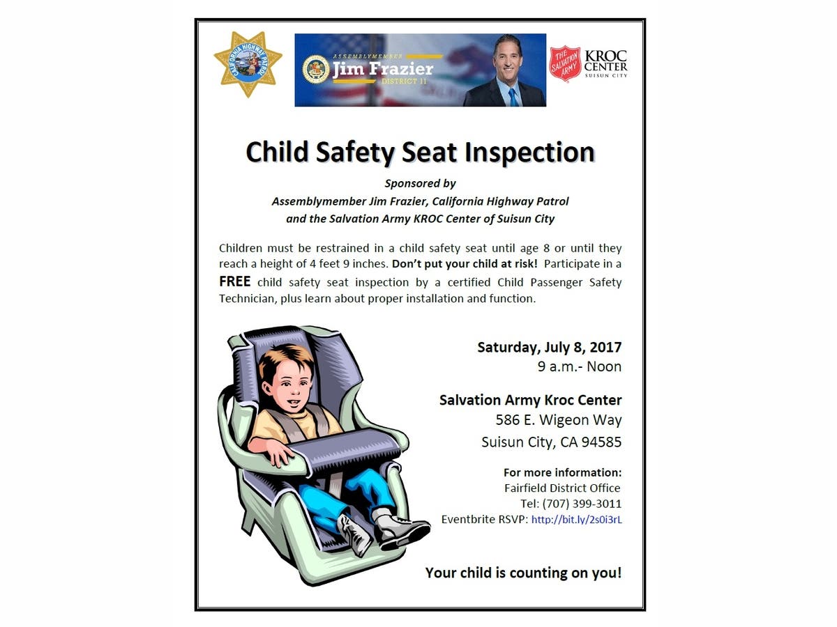 SUISUN CITY β Assemblymember Jim Frazier is teaming up with the California Highway Patrol to offer a free Child Safety-Seat Training for parents and caregivers in Solano County on Saturday, July 8, 2017.