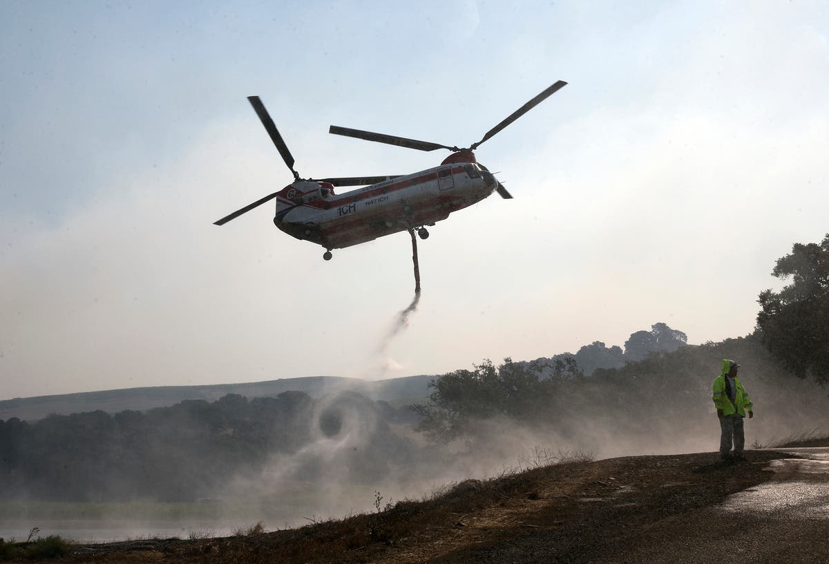 Photo: A helicopter draws water from a pond to help put out a fire near Napa, Calif., on Thursday, Oct. 12, 2017. Gusting winds and dry air forecast for Thursday could drive the next wave of devastating wildfires. (Rich Pedroncelli/Associated Press)