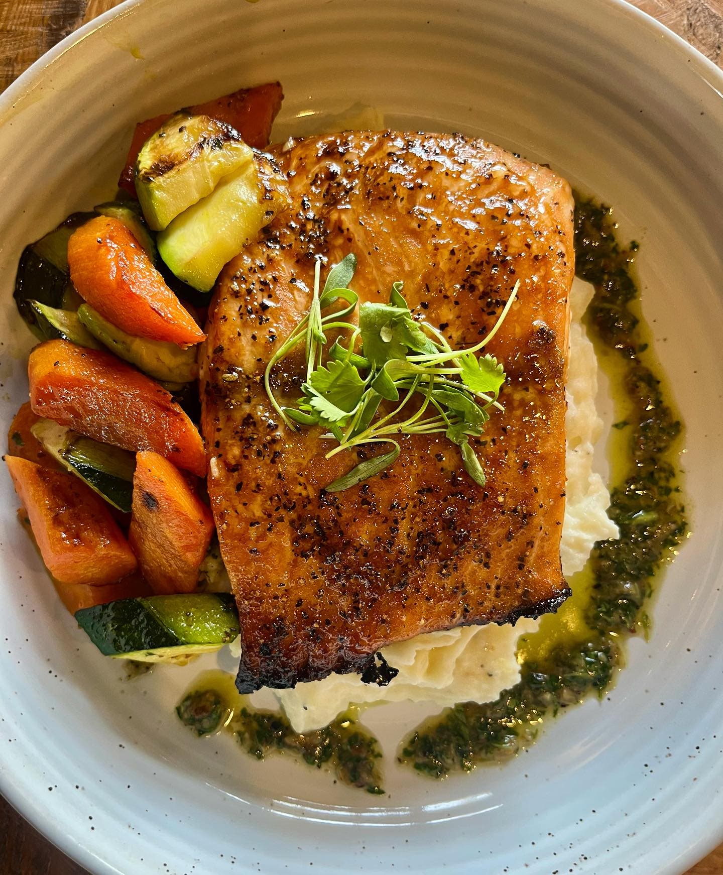 When you go, order from among her most ordered menu items: the Chipotle Honey Salmon with Mango Salsa—blackened salmon in honey tamarind chipotle sauce, served with cilantro jasmine rice.