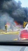 The vehicle was consumed by the flames, and the driver was transported to a hospital for treatment of second- and third-degree burns covering roughly 3 percent of his body, according to the fire department.