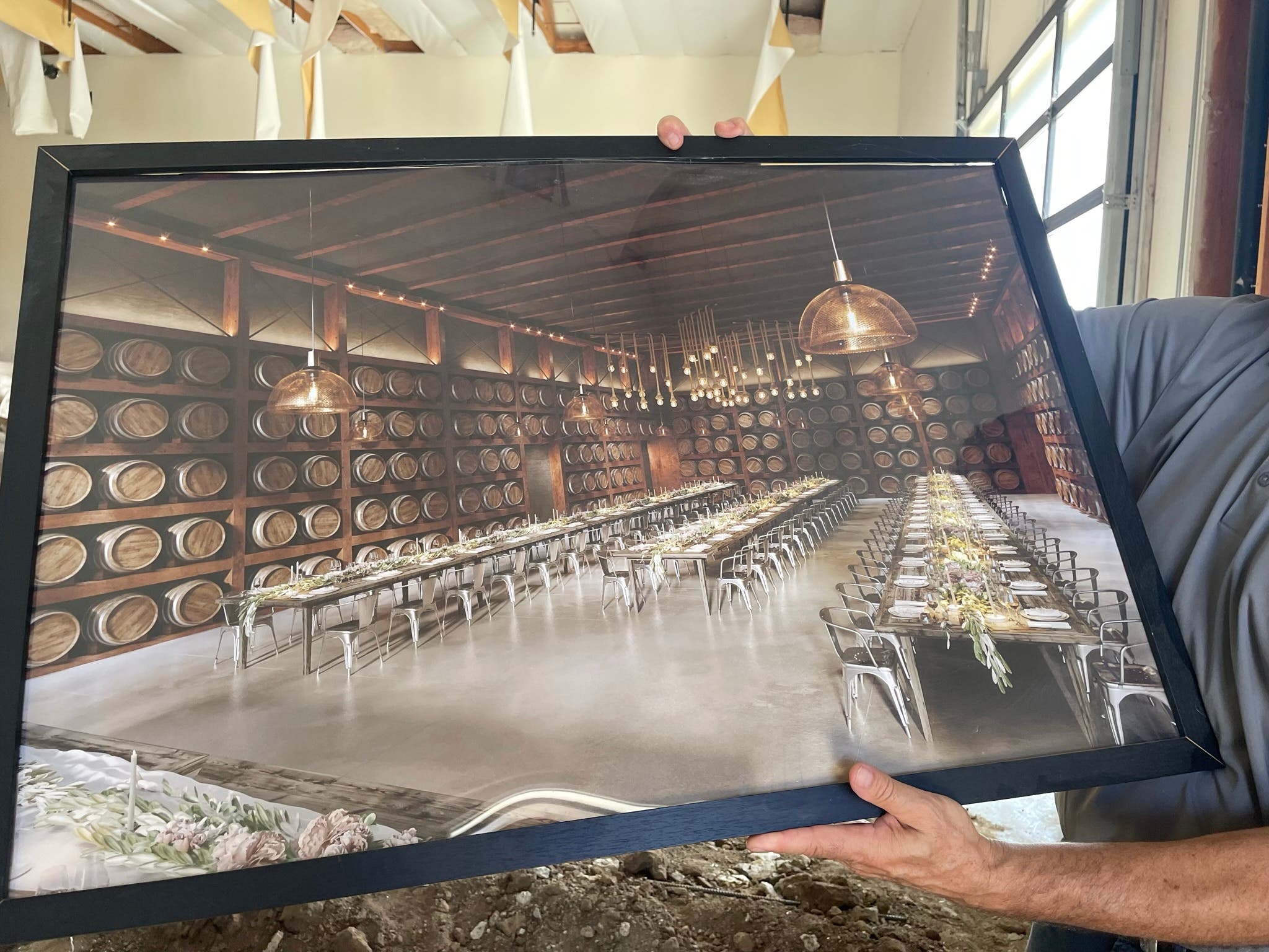 The large barrel room in the middle of the vineyard has been gutted, allowing for new restrooms to be built, as well as a retrofit of the back wall to become nearly solid glass. The outside wedding space will remain open and in the middle of the vineyard. However, inside will be a luxurious spot for events and receptions once it is completed early in 2024, he said.