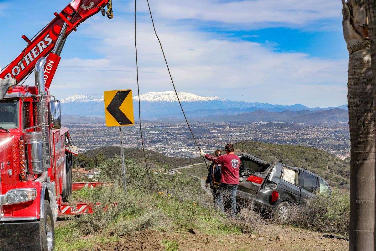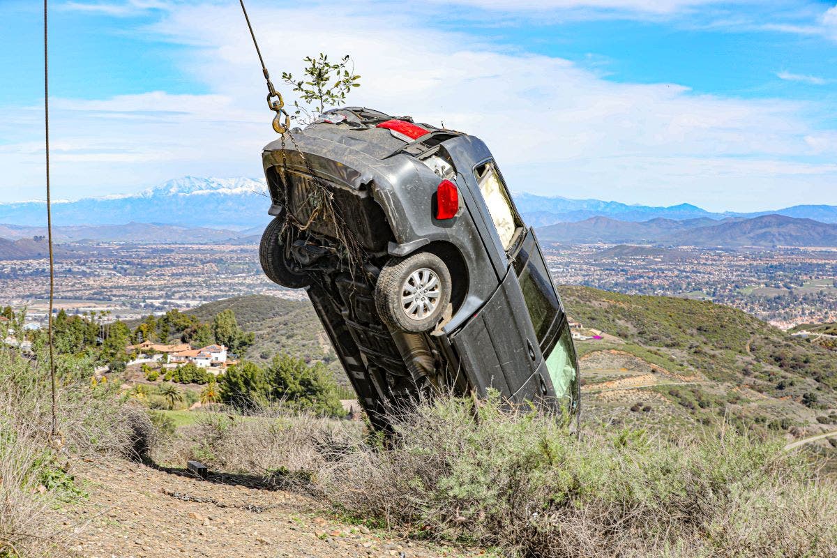 The vehicle was listed as "unrecoverable," CHP said. A tow truck was called to the scene to hoist the vehicle up the hill and back onto the road.