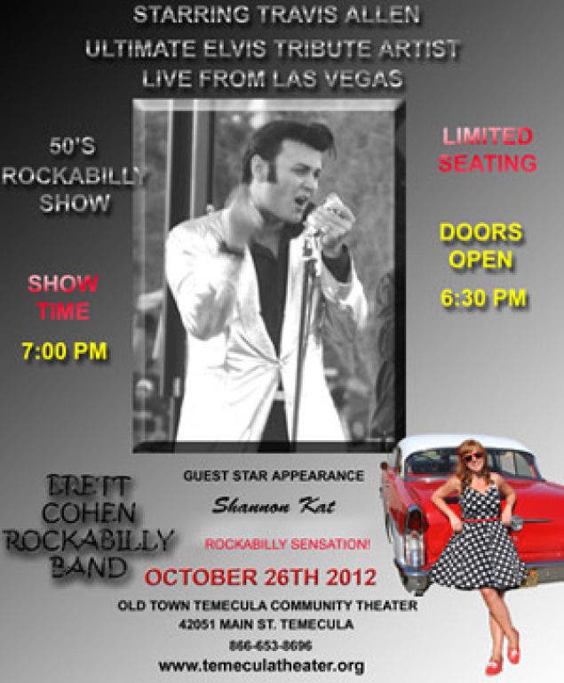 50’s Rockabilly Show is all about the good old days. Travis Allen, raised in Temecula Valley is proud to bring his talent once again to Old Town Temecula Community Theater. He resides in Las Vegas working daily as an Ultimate Elvis Tribute Artist, sanctioned by Elvis Presley Enterprises.