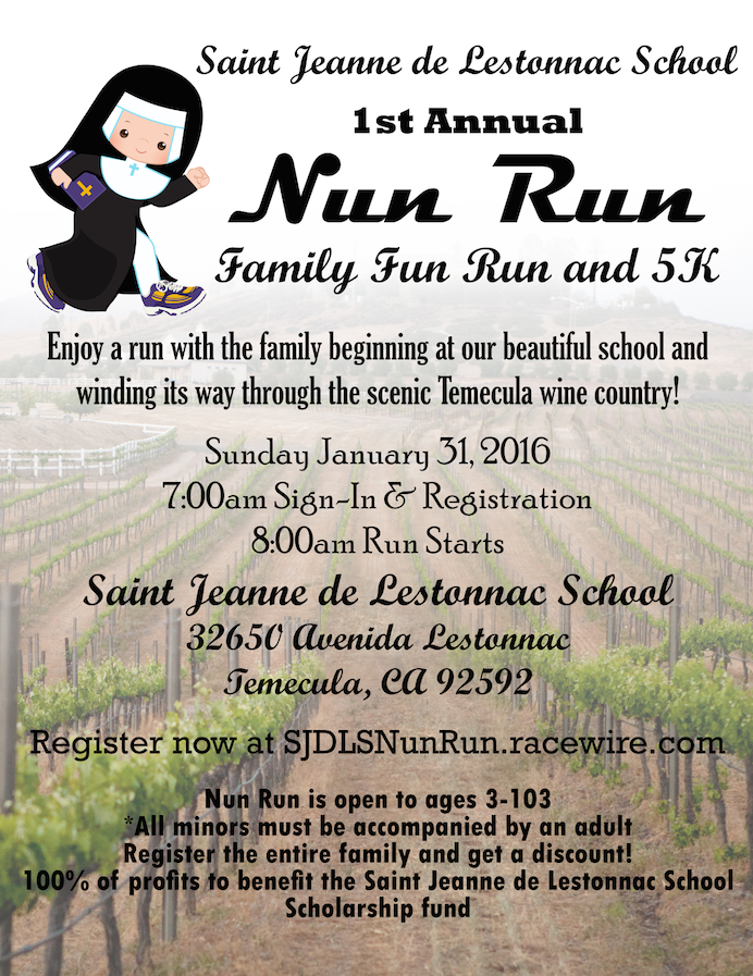 Enjoy a run beginning on our beautiful campus (32650 Avenida Lestonnac Temecula, 92592) and wind your way through scenic Temecula Wine Country. Sunday January 31, 2016. Nun Run is open to ALL!