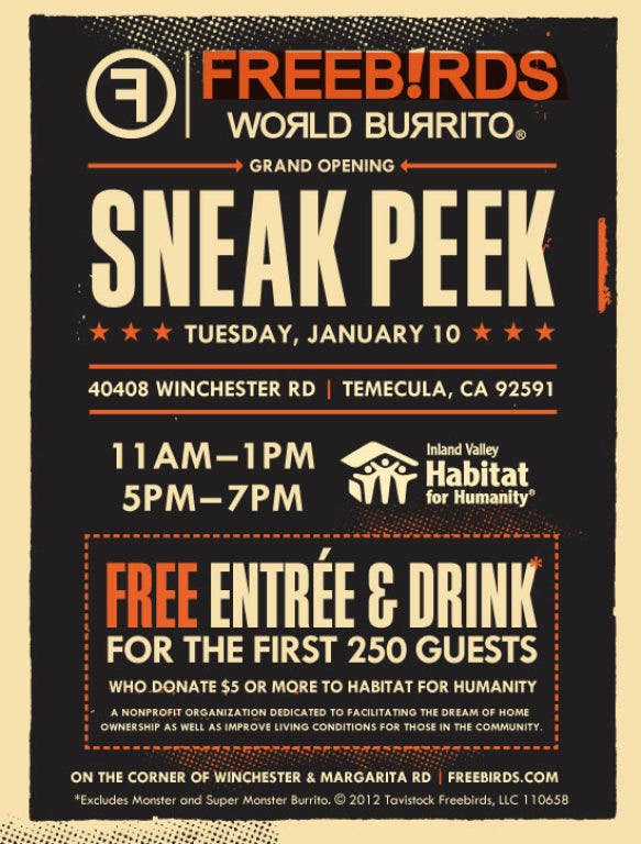 A new mexican food restaurant, Freebirds World Burrito, is offering a free entree and drink in exchange for a $5 donation to . Click on the flier above for details.