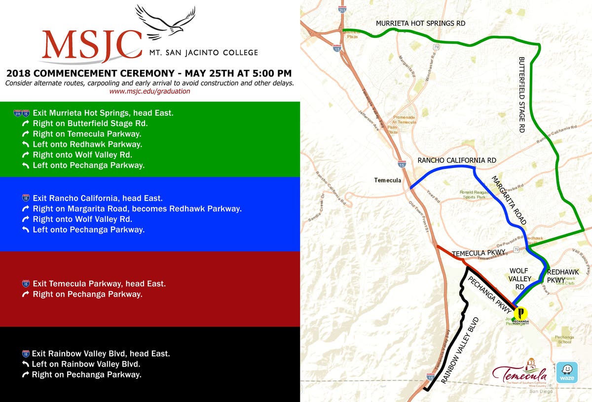 From MSJC: TRAFFIC ADVISORY: MAJOR EVENT SCHEDULED FOR FRIDAY MAY 25th : Mt. San Jacinto College Graduation Ceremony is scheduled for 5:00pm on Friday, May 25th at Pechanga Resort and Casino. Expect increased traffic congestion in the south end of Temecula during the afternoon/evening as more than 5,000 people are expected to attend the event. Please also note that this is Memorial Day weekend and Temecula Parkway Interchange is still under construction. Attendees should consider using alternative routes - see map provided. Check MSJC’s website for more information on the event: https://www.msjc.edu/Graduation