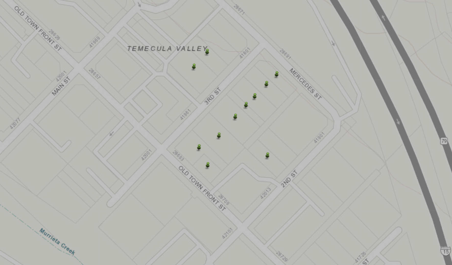 Notably, a large section of Old Town Temecula, near the Truax building, between 2nd and 3rd street, west of Mercedes Street and east of Old Town Front Street.
