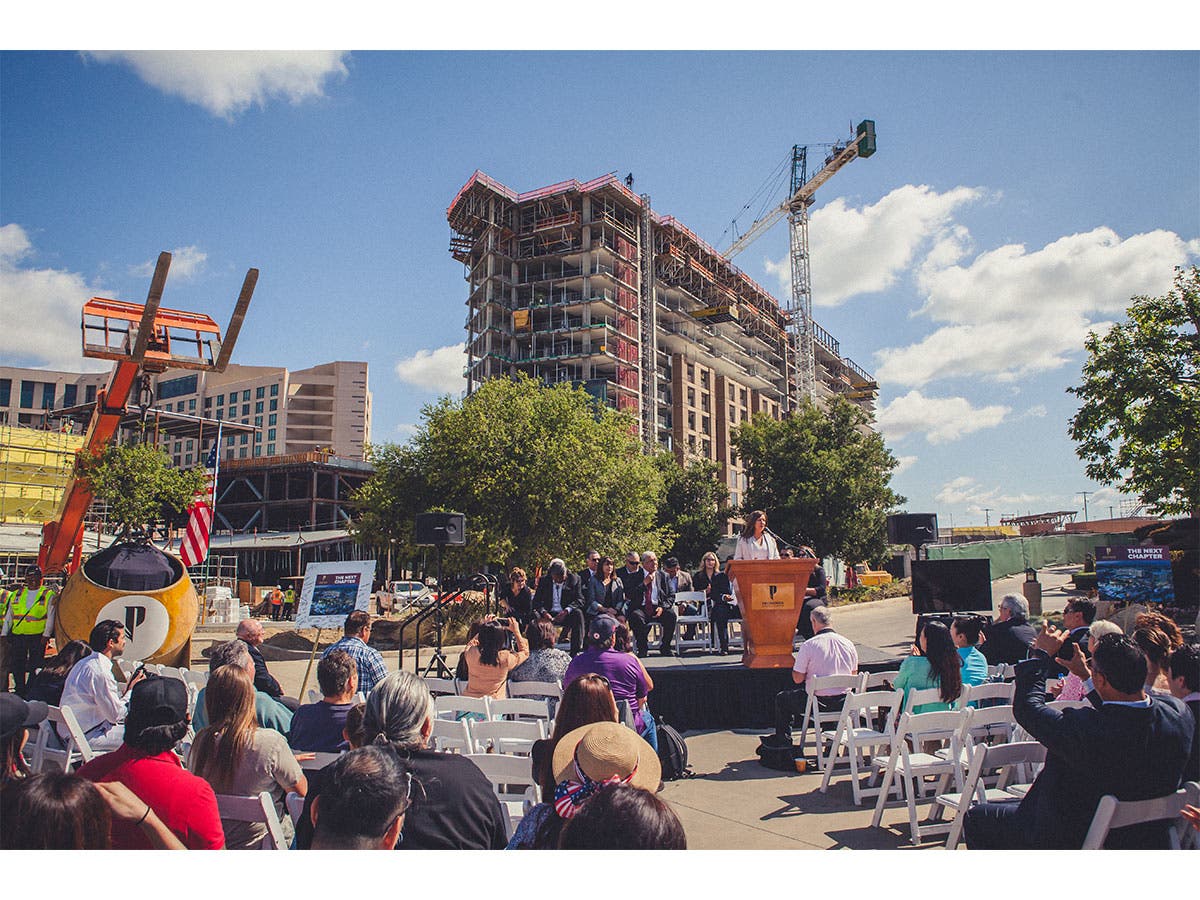 This topping out included crews 14 stories up pouring the last 710 tons of concrete into the upper framing of the new hotel tower that will house 568 rooms and suites. A giant, concrete-filled bucket the size of a mid-size car was hoisted via crane to the top of the south hotel wing and its contents poured into the structure. A small, sacred oak tree also hitched a ride onto the top of building with the bucket, and was placed atop the tower as a symbol of strength and perseverance. The ceremonial tree will be planted on the resort grounds at the expansion’s completion.