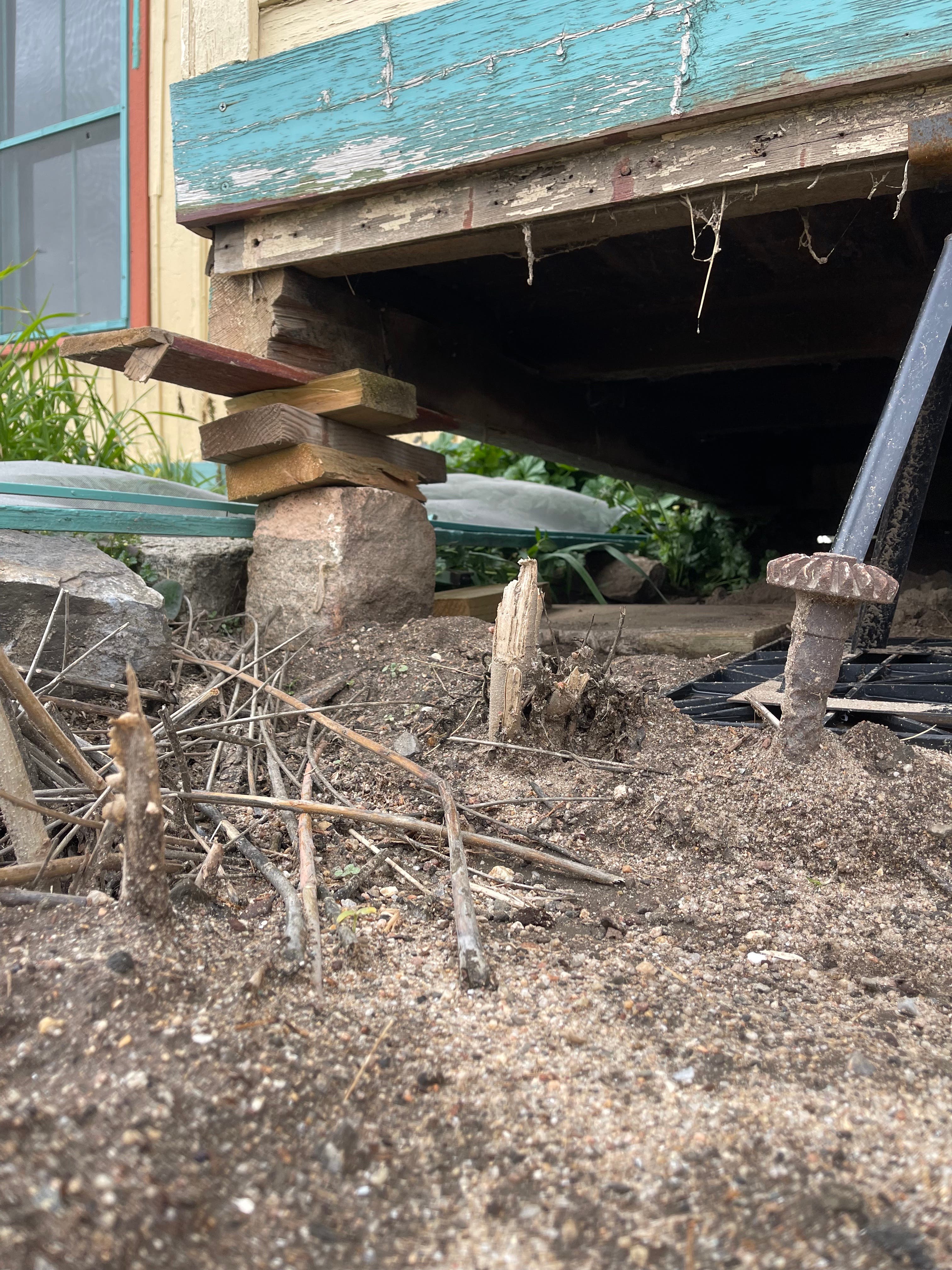 Now, things have changed. The house sits elevated on a haphazard "Jenga" pile of wood jacks. Its windows and walls are bowed and broken. Its only residents are vermin nesting within the walls and underneath the home.
