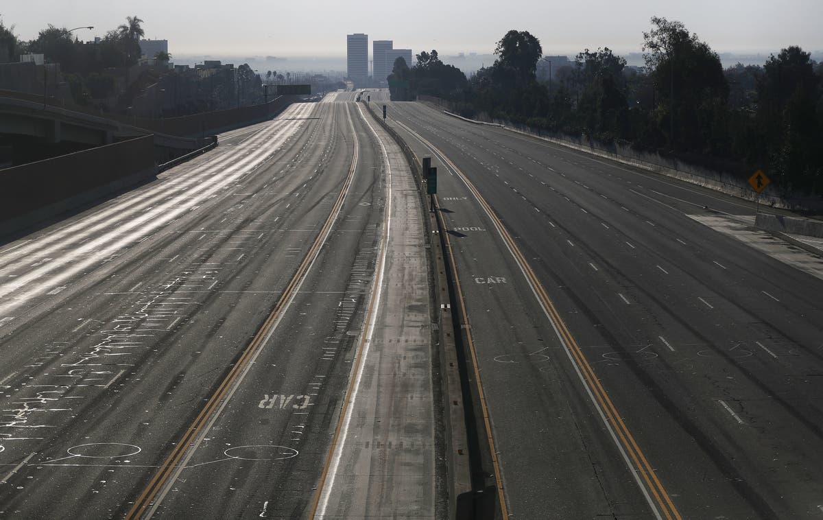 Interstate 405 is deserted after being closed during rush hour in an area near the Skirball Fire on December 6, 2017 in Los Angeles, California. Strong Santa Ana winds are rapidly pushing multiple wildfires across the region, expanding across tens of thousands of acres and destroying hundreds of homes and structures. (Photo by Mario Tama/Getty Images)