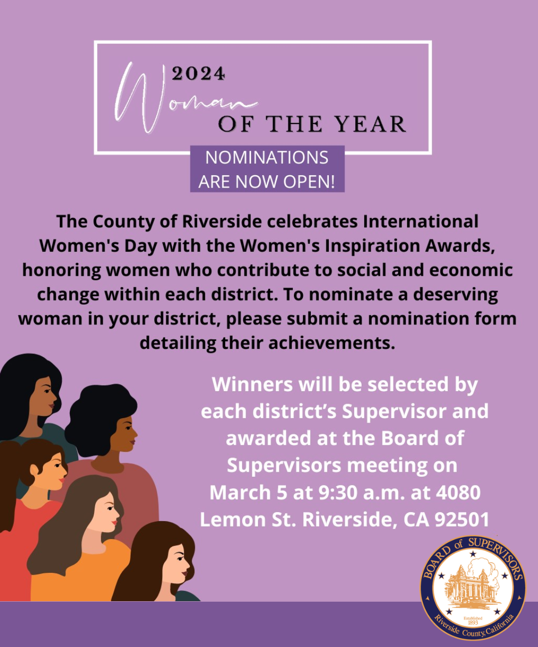 Winners will be celebrated by each Supervisorial District with a special presentation at the County Board of Supervisors meeting on March 5, 2024, at 9:30 a.m. at the County Administrative Center (4080 Lemon Street, Riverside).