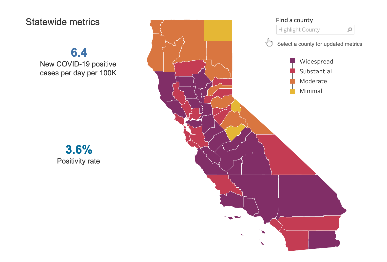 The above graphic shows the state's color-coded tiered framework. The California map below shows the updated colors assigned to each county (current as of Sept. 22). The state updates the data each Tuesday.