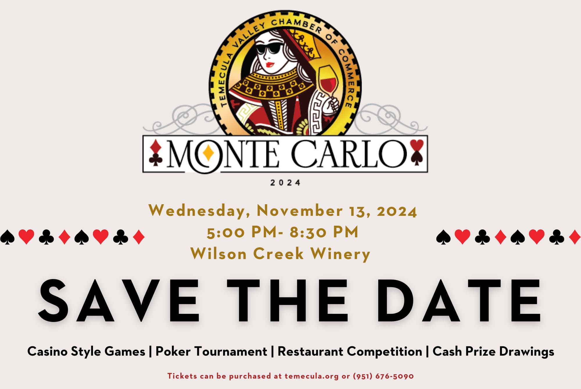 TEMECULA, CA—The 33rd Annual Monte Carlo Extravaganza, hosted by the Temecula Valley Chamber of Commerce, will be held from 5:30 to 8:30 p.m. on Wednesday, November 13,at Wilson Creek Winery.