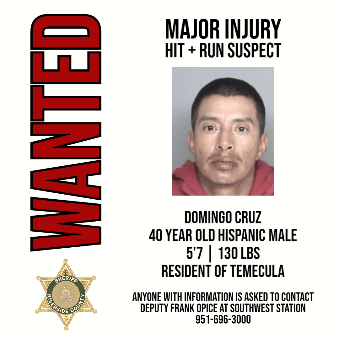 Cruz has a warrant for his arrest in the case. Anyone with information is asked to call Deputy Frank Opice at the Southwest Sheriff Station, 951-696-3000.
