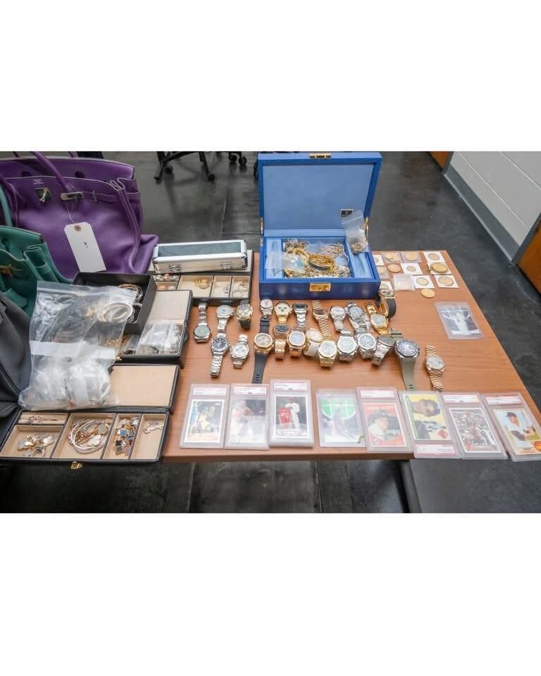 The property includes over 100 designer handbags, including Hermès Birkin, Chanel, and Louis Vuitton, as well as 22 high-end timepieces by Patek Philippe and Audemars Piguet, as well as coins, baseball trading cards, jewelry, numerous firearms, and $800,000 in cash.