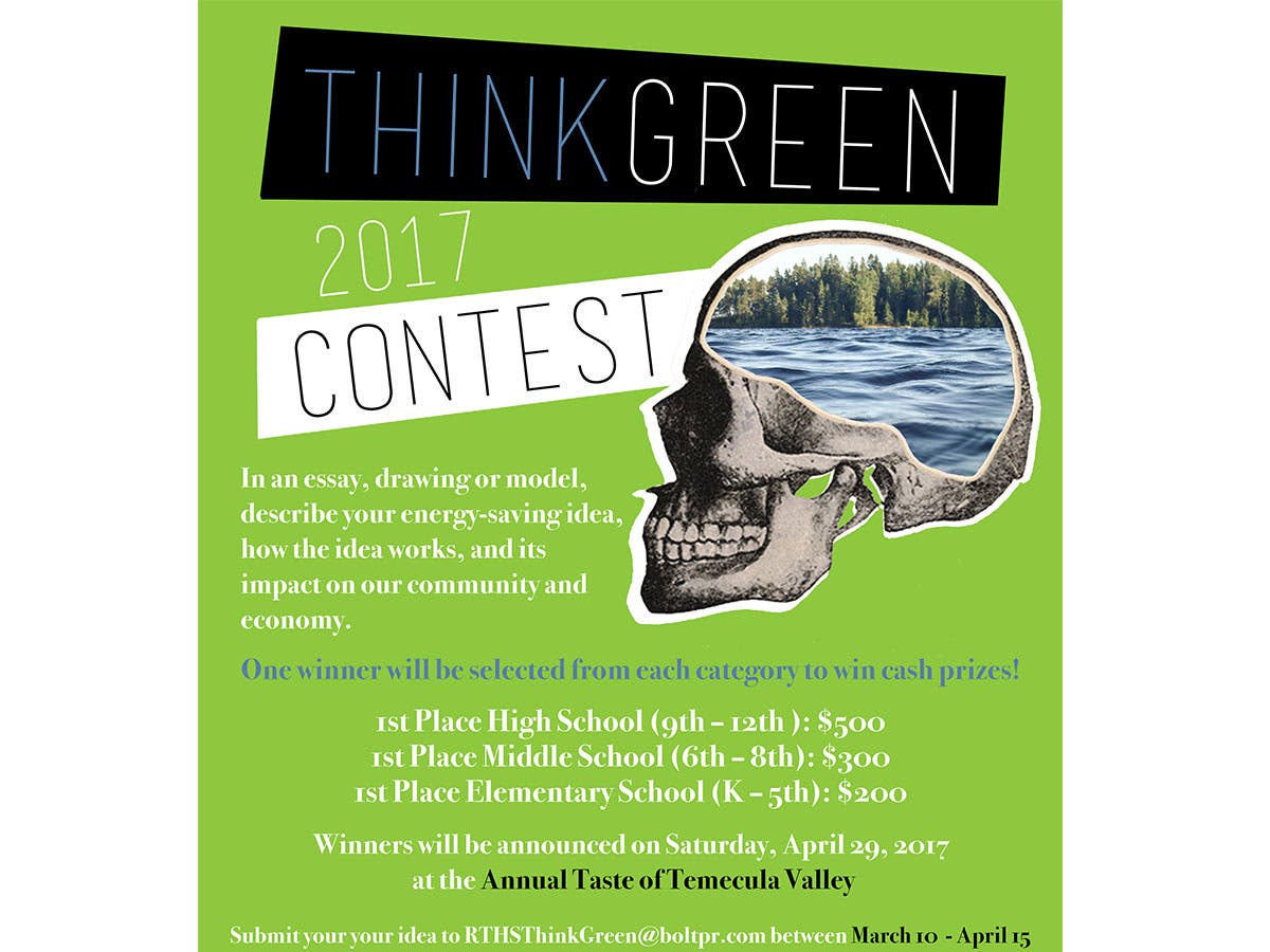 From RighTime Home Services: RighTime® Home Services, a residential heating, air conditioning and plumbing company in Riverside, has partnered with the Temecula Education Foundation (TEF) for the fifth annual “Think Green” Contest.” The Think Green Contest invites students in the Temecula Valley Unified School District to “think green” and submit an idea in the form of a written essay, drawing, model or video on how to conserve energy in their community. RighTime will be accepting entries between March 10 and April 15, 2017 for a chance to win cash prizes. Winners will be announced at the 7th Annual Taste of Temecula Valley on April 29, 2017.