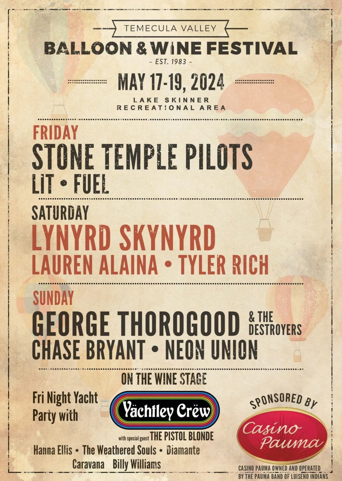 This year's headliners include Friday Night: Stone Temple Pilots, Saturday Night: Lynyrd Skynyrd, and Sunday Night: George Thorogood and the Destroyers. Joining those headliners are Lit, Fuel on Friday, Lauren Alaina and Tyler Rich on Saturday, and Chase Bryant on Sunday. Yachtly Crew will be on the more intimate Wine Stage Friday night, and officials say more artists are still being added to the calendar.