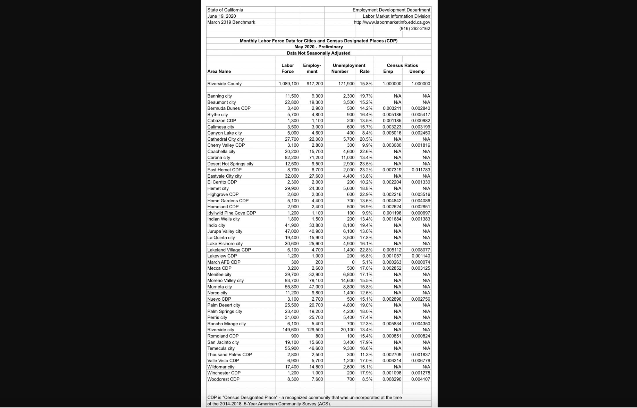 Locally, Desert Hot Springs had the highest unemployment rate countywide at 23.5%, followed by the unincorporated community of East Hemet at 23.2%, and Highgrove at 22.9%.