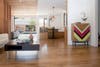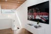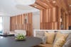 Using DEX Studio’s signature visual language of texture and natural materials, the home provides an open but idiosyncratic feel that stimulates the senses. The firm’s esteemed wood features on the façade run the height of the first and second stories; this feature carries over into the interior of the house where it serves as a screening device for the stairs and a dividing feature between the public and private spaces.