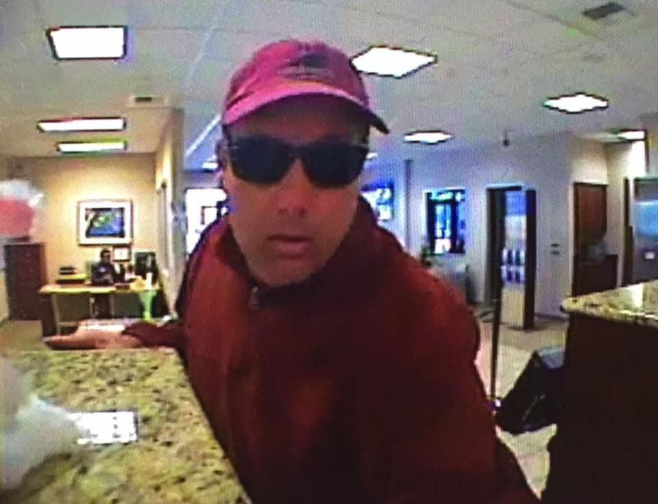 The suspect is described as a white man, 5 feet 10 inches tall, 200 pounds, and wearing a burgundy baseball hat and a burgundy sweater.