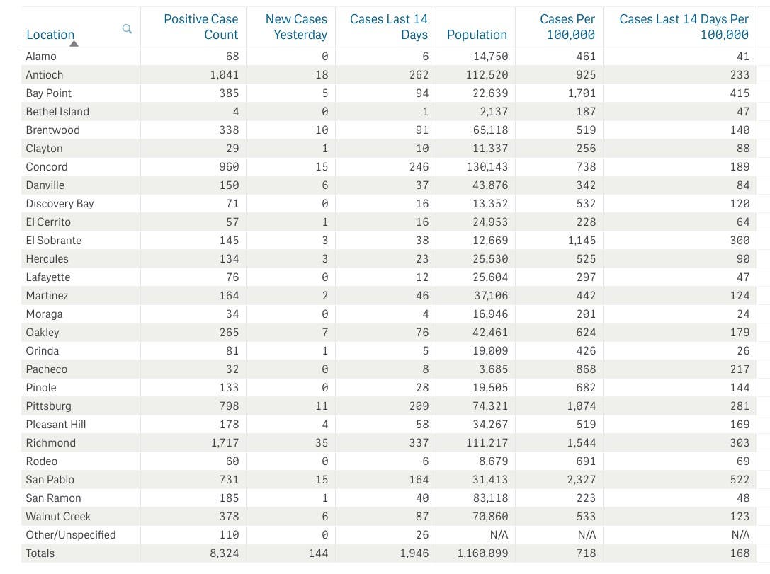 Here is a look at city-by-city coronavirus cases in Contra Costa County:
