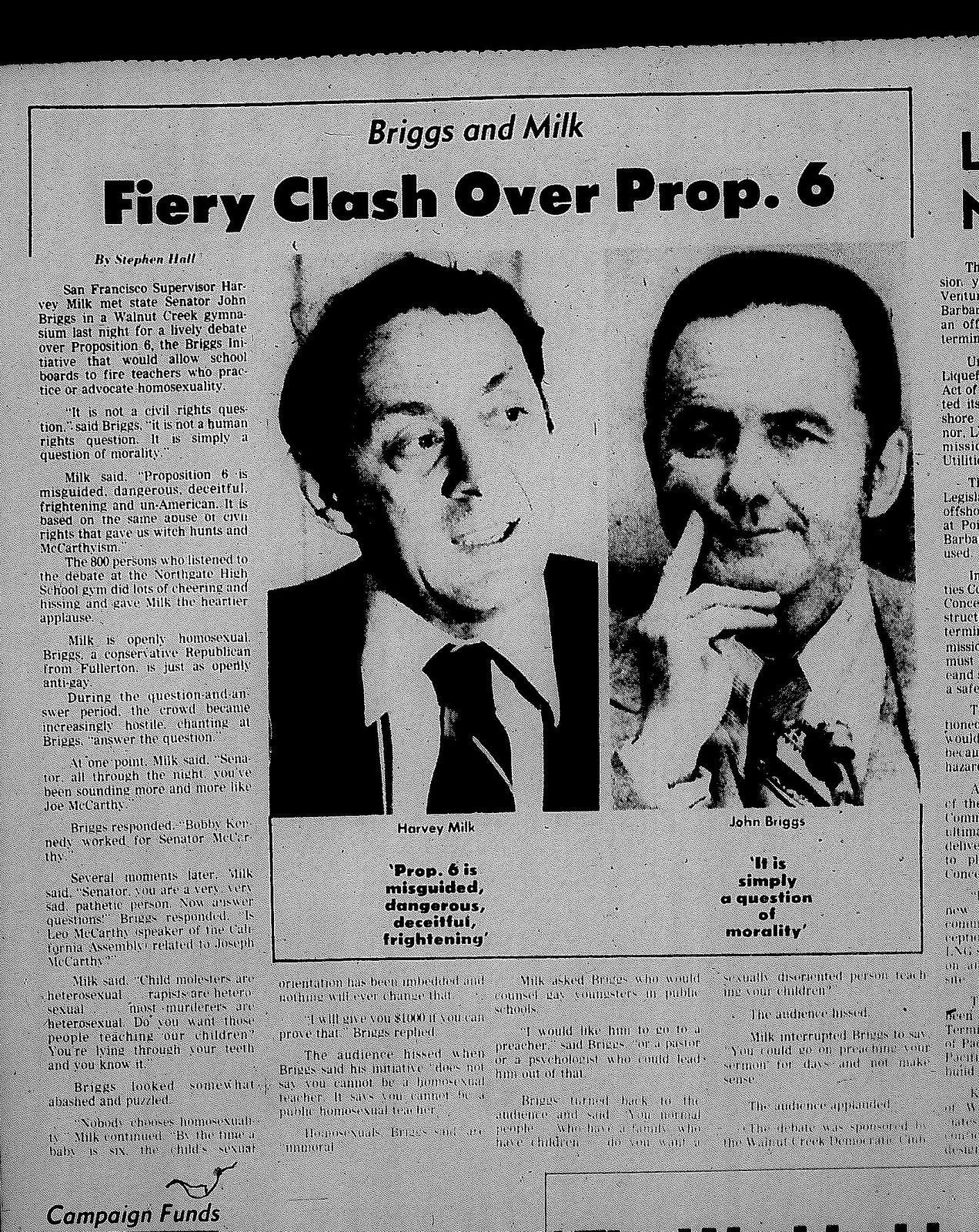 In his biography of Milk, The Mayor of Castro Street: The Life and Times of Harvey Milk, the late Randy Shilts described how Briggs and Milk engaged in numerous debates around the state--some in school gymnasiums.