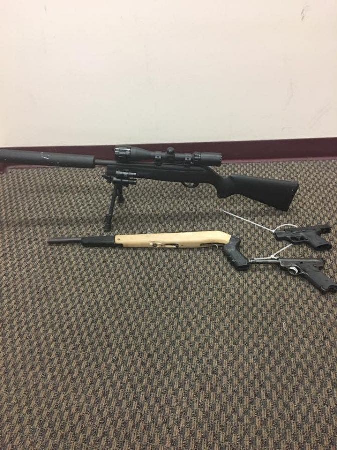 One of the firearms had a fixed silencer. Officers also found a rifle with a pistol grip and a barrel that was cut, making it shorter than the legal length of 26 inches, police said.
