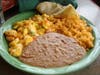 I ordered a Shrimp Scramble. Like the rollos, it was well-plated, and accompanied by the usual frijoles and Spanish rice. The latter were decent, and the eggs—scrambled with plump shrimp and cheddar cheese—was very good, although a bit too mild for my taste. I added some of the salsa from the rollos, to spice it up a bit.