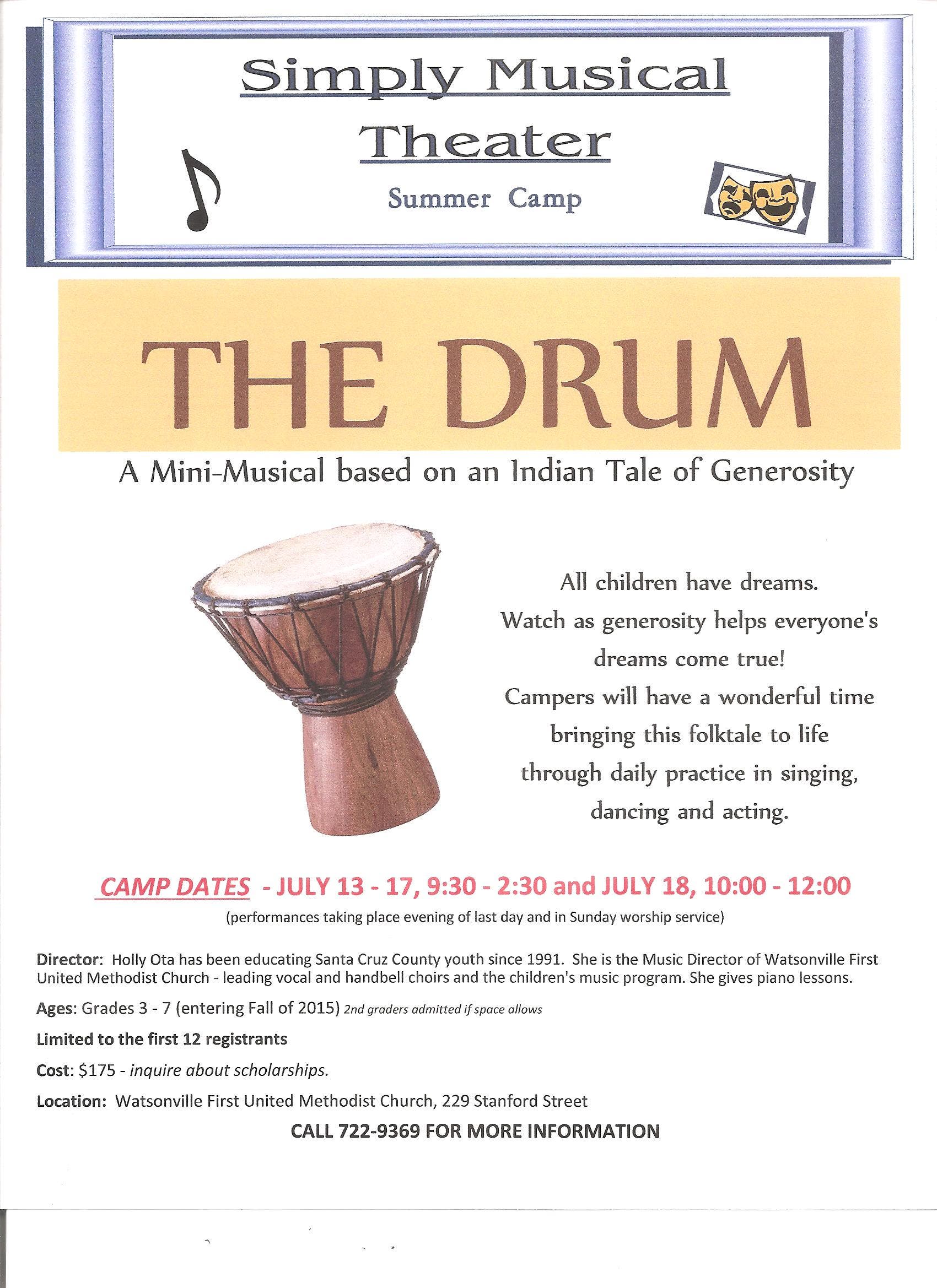 Simply Musical Theater presents “The Drum,” a mini-musical based on an Indian Tale of Generosity. Students in Grades 3-7 (entering Fall of 2015) are invited to bring this folk tale to life through song, dance and acting. One child’s generosity helps everyone’s dreams come true!