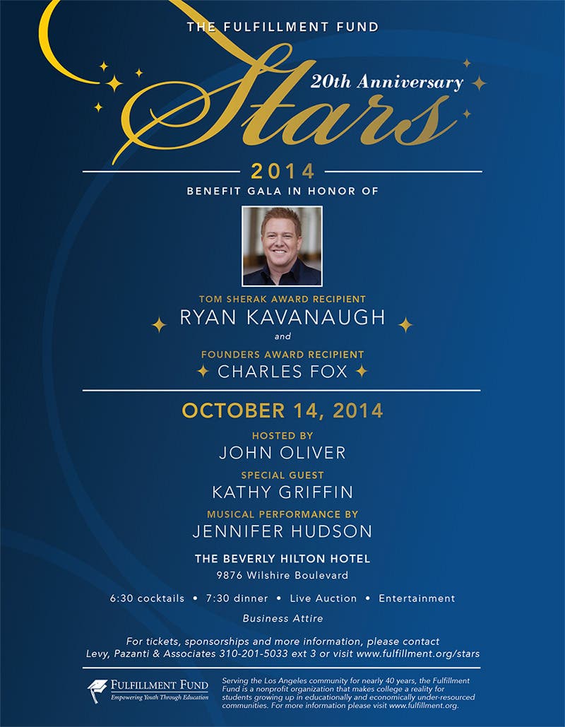 Join us for the 20th Anniversary of the Fulfillment Fund Stars Benefit Gala 2014 honoring Relativity Founder and Chief Executive Officer, Ryan Kavanaughwho will be receiving the Tom Sherak Award. Longtime Fulfillment Fund Board Member, Charles Fox will also be honored with an award for his contributions to the organization.