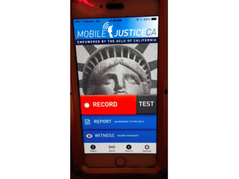 The app also can be used to send alerts to others to go to a location to document an incident. A report detailing the event can be sent to ACLU using the app.